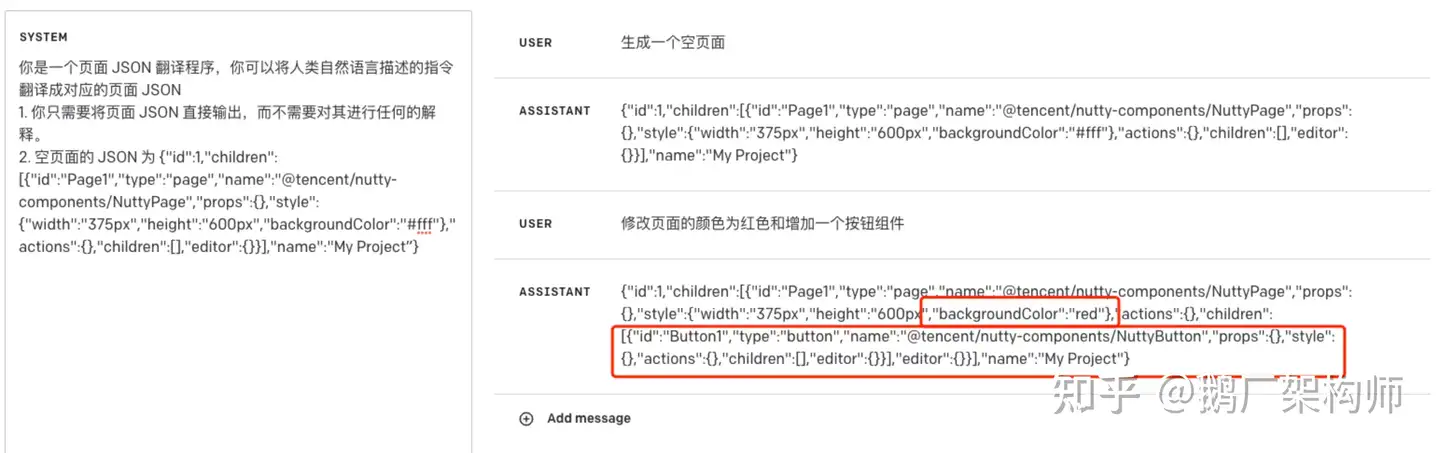 但目前 ChatGPT 返回的页面 JSON 是不能描述我们的低代码页面的,所以需要教会它我们业务的页面 JSON 结构。