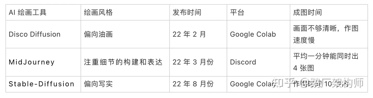 2022 年初,Disco Diffusion 横空出世引发了第一波 AIGC 爆点,但是画面不够清晰,作图速度慢。同年 7月份 Midjourney 开放公测,使用 Discord 端作画,1 分钟之内可以同时出 4 张图。8 月份,Stable Diffusion 正式发布,作图速度缩短至 10 秒之内。