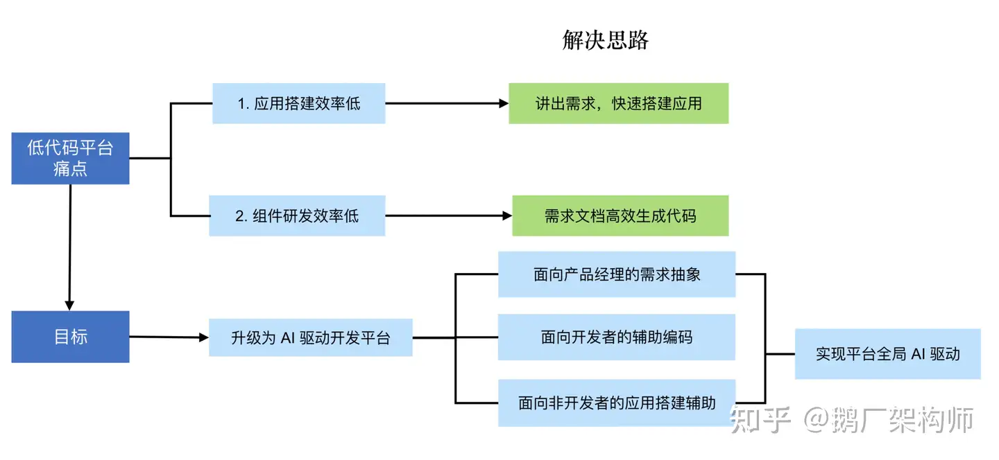 目标:将现有的低代码平台升级为 “AI 驱动应用开发平台”,针对三类不同的使用人群进行赋能提效,实现平台全局 AI 驱动。