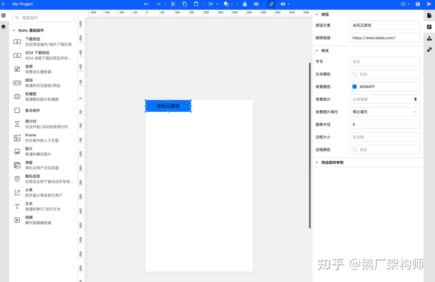 4. 按钮组件的 name 为 @tencent/nutty-components/NuttyButton,props 有 text 和 jumpUrl。