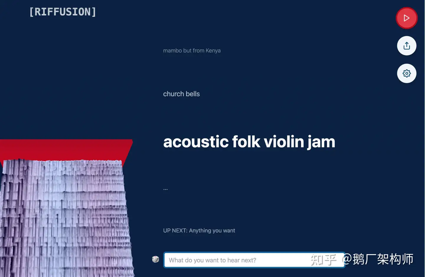 AI 生成音乐的产品有 Riffusion,用户输入一段文字,模型根据内容输出一段音乐。