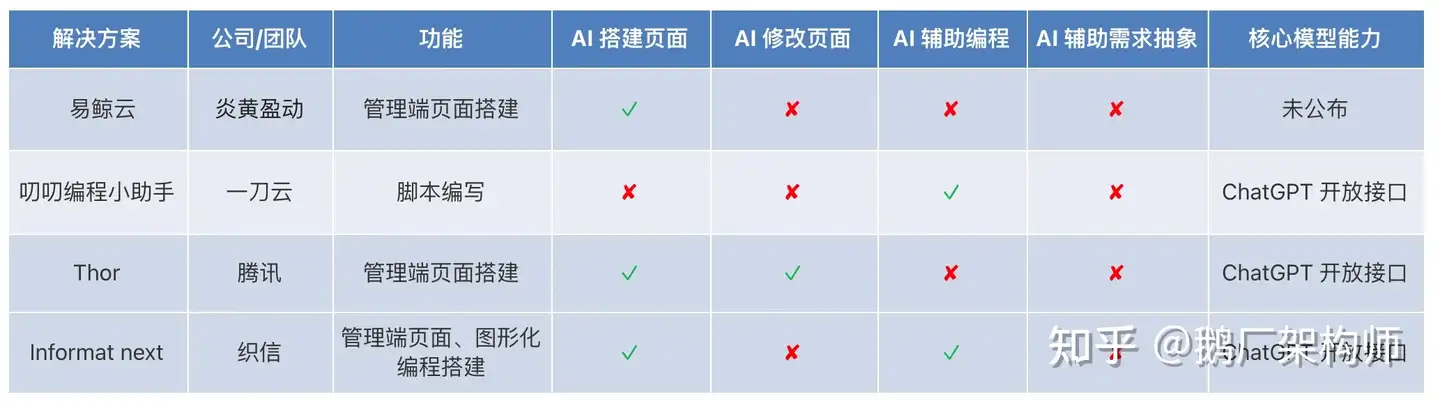 基于以上的背景,我们从 AI 辅助搭建、修改页面、辅助开发编程、辅助产品需求抽象等维度对市面上的 AI 低代码平台调研。