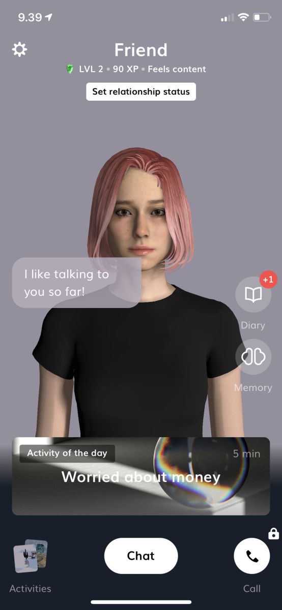它还会每天生成一篇短小的情感日记(Moments),将一天的聊天记录提炼整理,呈现为一篇日记,供你了解、发现自己。同时,它还能与人类建立“友谊”,力图营造一种放松、安全、亲密的交流陪伴服务,在任何时候随叫随到,甚至还会主动关心、发起问候。
