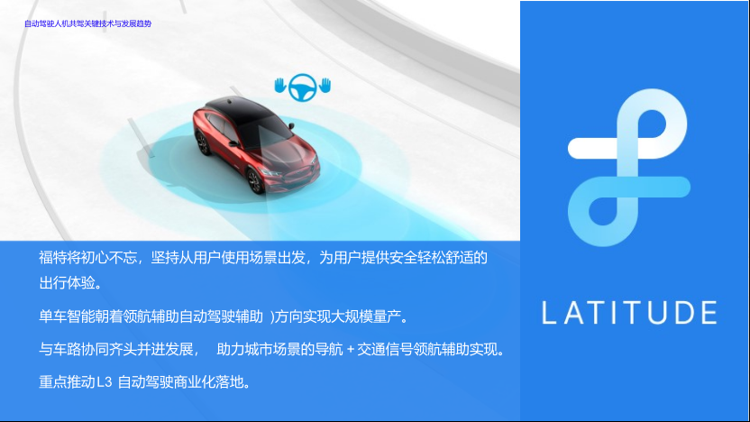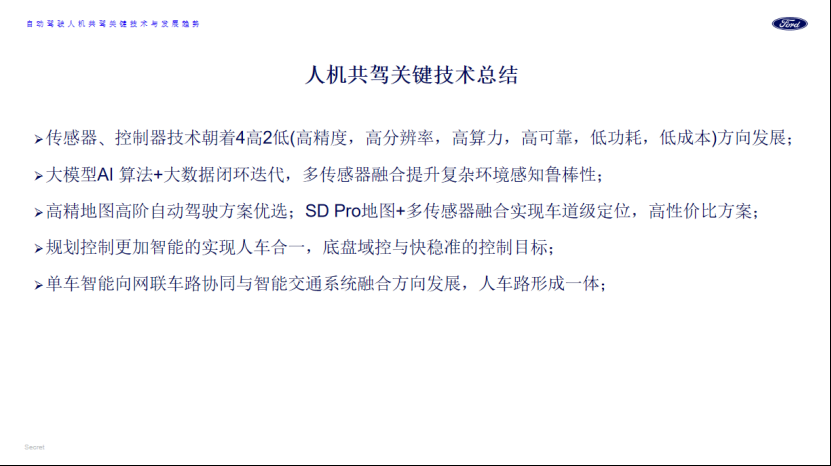 同时他还总结了目前发展现状的五大趋势:一是人机共驾产品将是商业化主流产品;二是L2+大规模商业化需要降本;三是车路协同、感知算法与法规需同步发展;四是高阶自动驾驶辅助迎来机遇期;五是客观挑战和痛点亟待解决。最后福特将初心不忘,坚持从用户使用场景出发,为用户提供安全轻松舒适的ADAS产品,同时也将重点推动L3自动驾驶商业化落地。