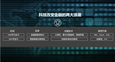 科技改变金融,已经经历了两次大浪潮。Fintech1.0时代显著特点是金融数据信息化。利用IT和互联网为金融用户提供线上服务,简化业务流程,优化服务界面,如IBM,EMC等。Fintech2.0时代的主要特征是营销渠道互联网化,这得益于互联网与移动互联网技术的飞速发展,如余额宝、P2P等。