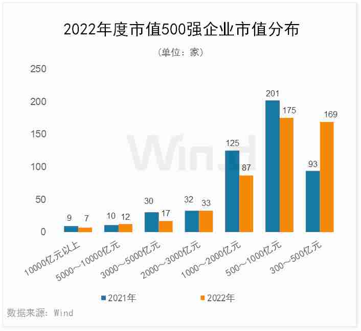 2022年度,万亿市值以上企业有7家,相比2021年减少2家;5000亿~10000亿元的企业有12家,相比2021年增加2家;3000亿-5000亿元的企业有17家,相比2021年减少13家;2000亿-3000亿元的企业有33家,相比2021年增加1家;1000亿-2000亿元的企业有87家,相比2021年减少38家。