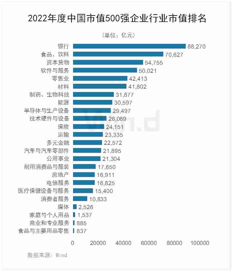In terms of the industry market value ranking of the top 500 companies. The total market value of the banking industry was the highest at over 8 trillion yuan, followed by the food and beverage and capital goods industries at 7.06 trillion yuan and 5.48 trillion yuan, respectively.
