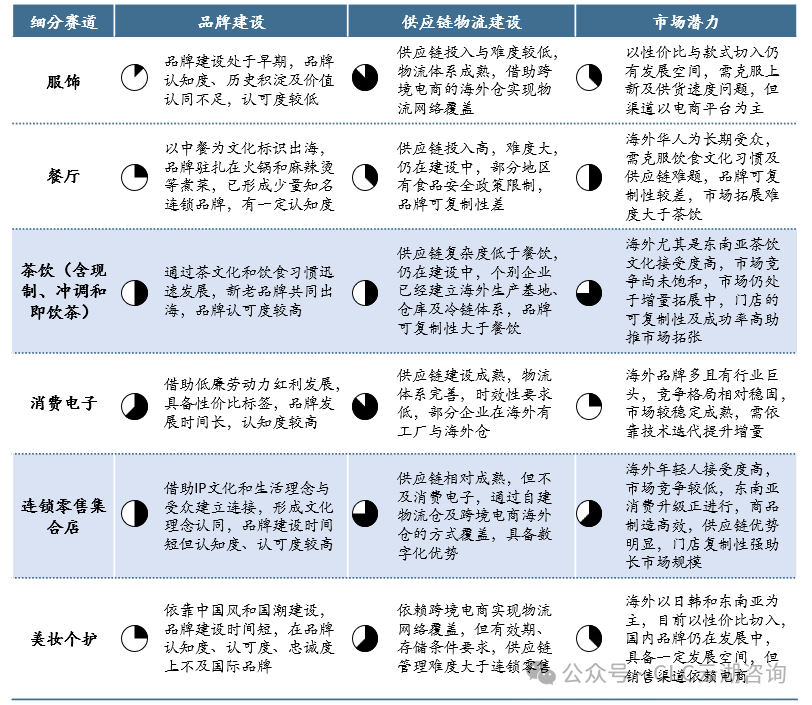 •品牌建设:消费电子>茶饮&连锁零售集合店>餐厅&美妆个护>服饰。消费电子属于早一批产能出海的赛道,具备先发优势;茶饮及连锁零售集合店的文化认同感较高,品牌已具备相当知名度;餐厅及美妆个护已形成一定品牌力,而服饰品牌力较弱。