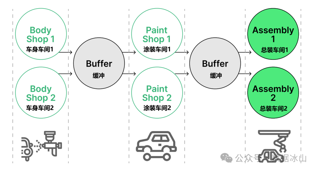 整车厂包括车身、涂装、总装三大工艺,每个工艺两个车间。