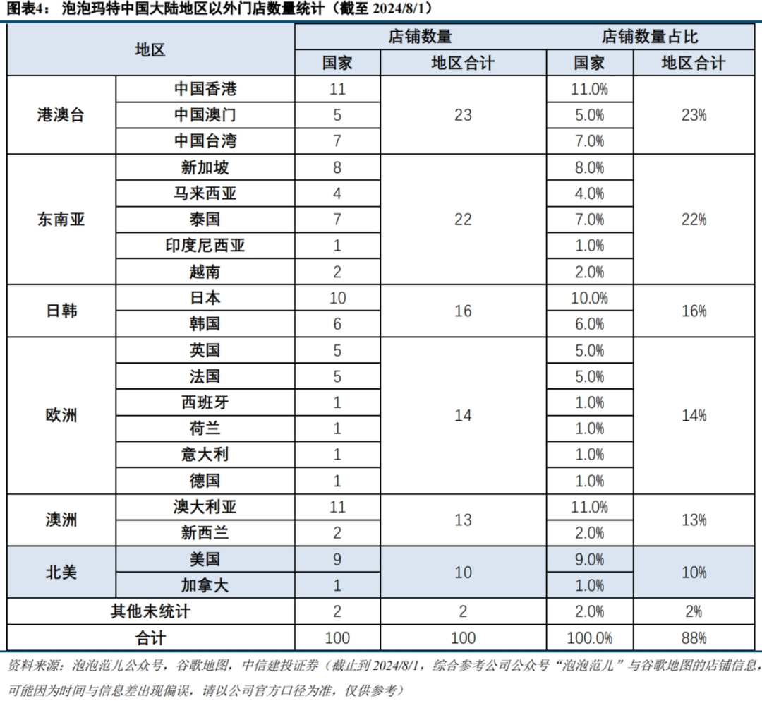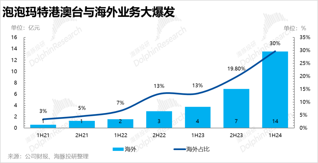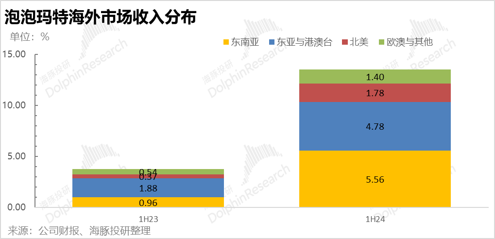 2022年泡泡玛特开始认真把眼光投向海外,2023年上半年才算开始铺了一点摊子,2023年下半年海外开始收获了,到了今年上半年,海外(含港澳台)的收入占比直接拉到了30%。13.5亿的收入体量、260%的同比增速,泡泡玛特算是彻底打响了海外市场。