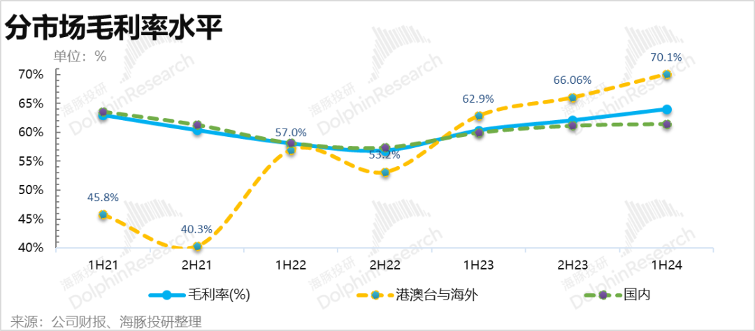 但更加令人激动的是,海外市场因为定价高,毛利率还更高:国内业务的毛利率也就是60%上下的水平,海外业务毛利率几乎比国内高出10个百分点!随着海外批发业务占比越走月低,海外业务毛利率站上72%,确定性非常高。
