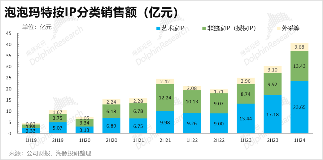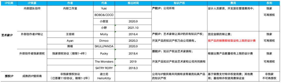 泡泡玛特从IP的角度,主要分自有IP、独家和非独家,其中自有IP和独家IP是泡泡玛特的核心竞争力,上次的披露口径调整之后,把独家和自有IP统称为艺术家IP。通常这类IP的毛利率更高。