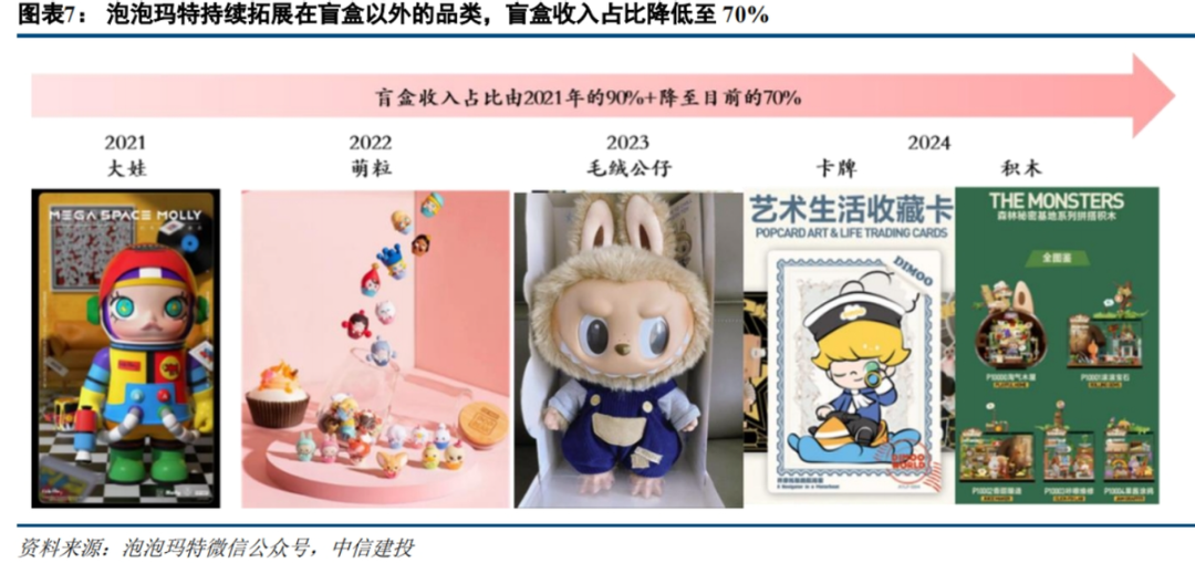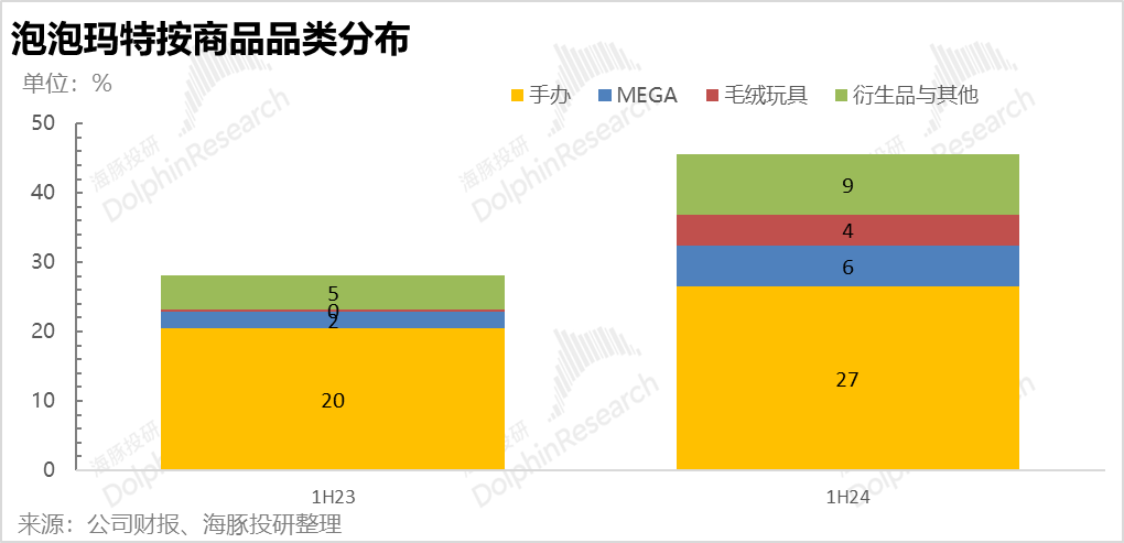 今年上半年,它Labubu的毛绒公仔也开始起量,多品类增长的带动下,手办的收入占比已经从去年同期的70%+下降到了不足60%。