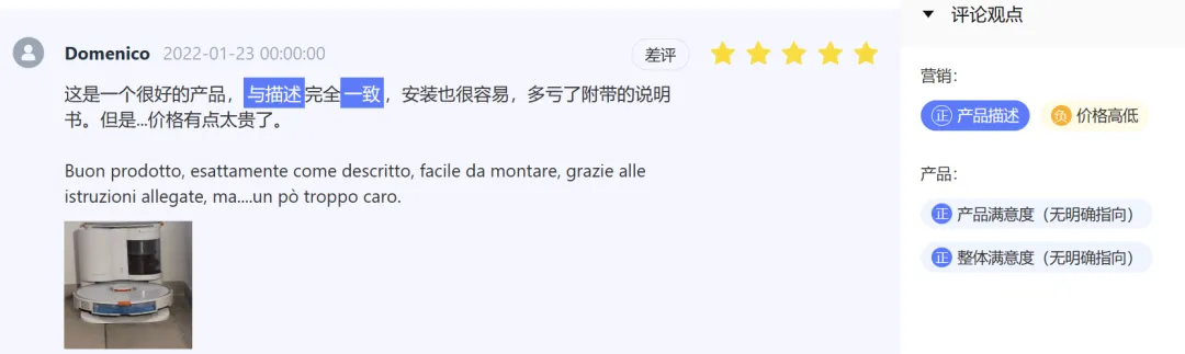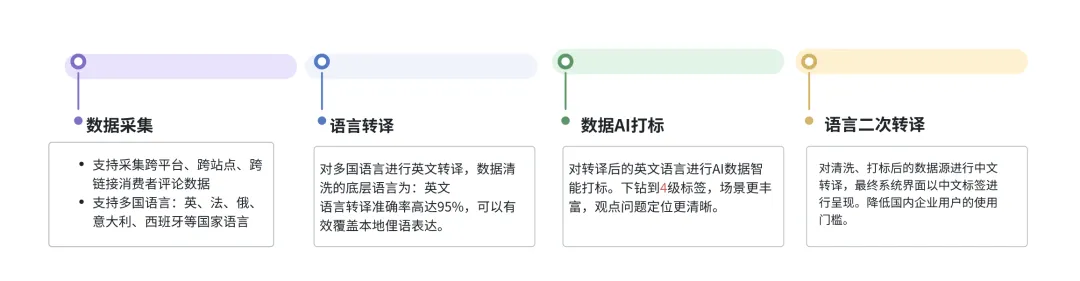 - 语言处理:利用AI能力对多国多语言的消费者评价数据进行清洗、打标、聚合、呈现、分析。观点准确率高达85%以上,同时提供评论原文、英文、中文三种语言呈现,降低使用者门槛,听懂消费者语言。