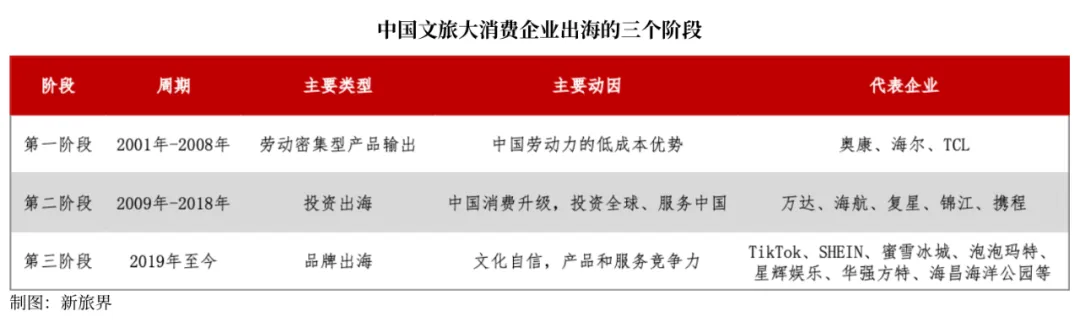 今天我们仅梳理过去20年左右时间里中国文旅大消费企业的出海,大致经历了劳动密集型产品输出(2001——2008年)、投资出海(2009——2018年)、品牌出海(2019年至今)三个阶段。