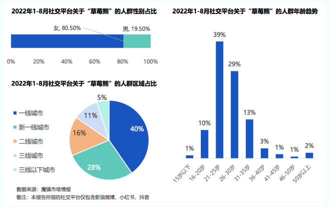 不过,我们细数近两年名创优品开发比较成功的IP联名,大概分为两大类,一类是全球知名公司旗下的热门IP形象,比如迪士尼的米老鼠和草莓熊、美泰的芭比、三丽鸥的Hello Kitty和库洛米,这类IP不仅受众群体广泛,且粉丝群体更为稳定,这也为企业的IP投入回报提供了保障。魔镜洞察数据也显示,像迪士尼的草莓熊受众群体主要是年轻女性,21岁-25岁是核心人群年龄段。同时草莓熊IP的人群主要集中于一线城市及新一线城市,占比逼近70%,三线及以下城市占比较低。另一类是,具备情绪价值、强互动性和社交属性的IP,比如走红于网络、热度较高的LOOPY露比、chiikawa等表情包。