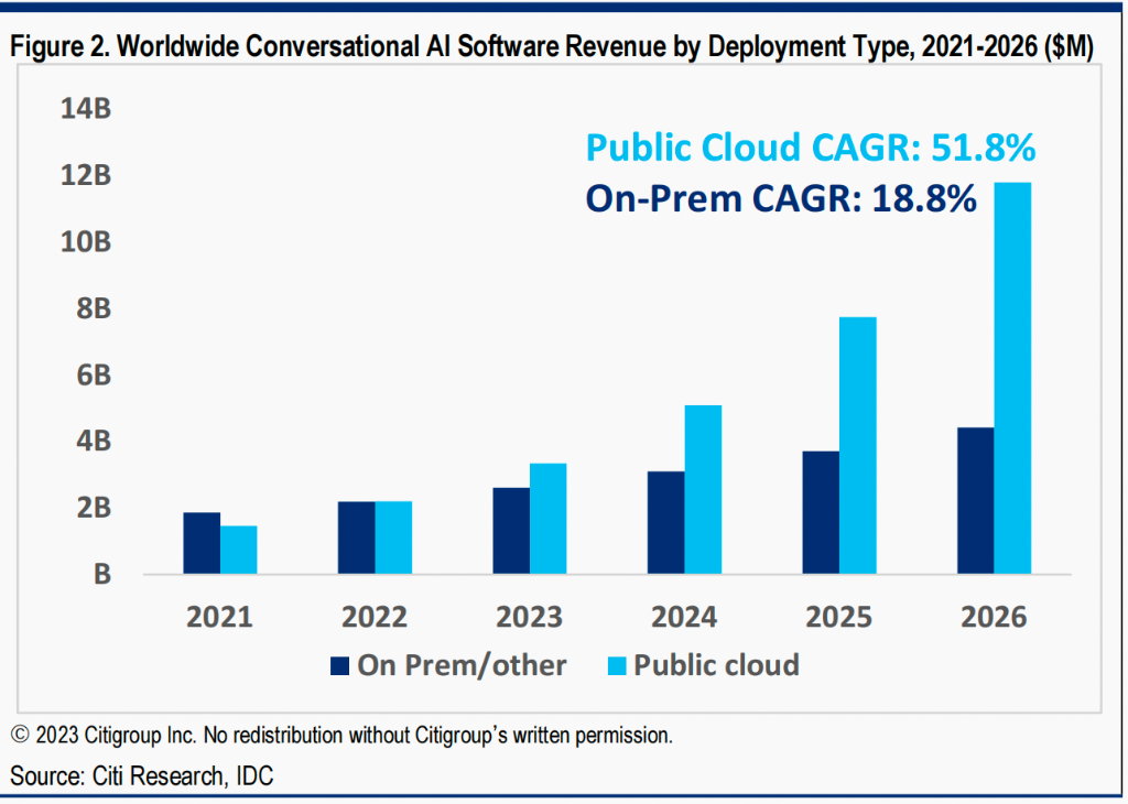 对话式AI市场预计将以37%的复合年增长率增长,从2021的33亿美元增长到2026年的160亿美元;公有云的复合年增速约52%,本地解决方案的复合年增率为19%。值得注意的是,该报告于2022年7月发布,ChatGPT在2022年11月晚些时候发布,可能低估了未来的市场增长潜力。