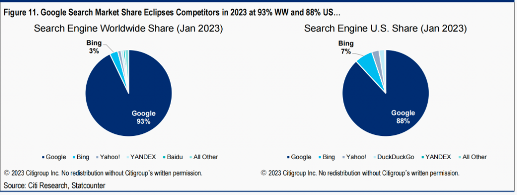 据Statcounter统计,截至1月,谷歌在全球搜索引擎市场拥有93%的份额,Chrome拥有约65%的份额。尽管考虑到谷歌核心搜索广告产品的效率和ROI,任何重大份额转移都需要一段时间,但Bing或Edge仍可能从谷歌占据主导地位的搜索市场中获取更多份额。