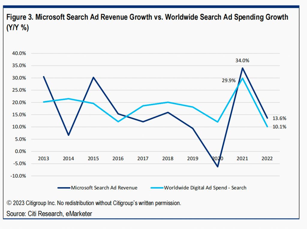 关于最关键的问题,微软能否凭借Bing挑战谷歌,获得更多搜索市场份额?花旗认为: