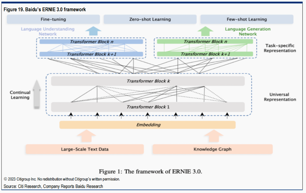 2021年7月,百度推出Ernie 3.0,这是该公司用于预训练大规模知识增强模型的统一框架。该模型在由纯文本和大规模知识图组成的4TB语料库上,使用100亿个参数进行训练。