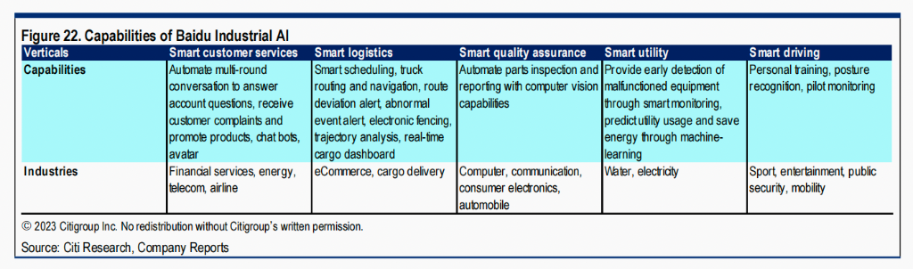 1、行业应用:百度将专注于交通、制造、能源、公用事业、公共服务金融服务领域的垂直解决方案,通过整合支持垂直智能应用的通用能力,提高可复制性和成本效率。例如,百度ACE智能交通已被41个城市采用。2、 通用人工智能产品:百度在制造业、金融服务、能源和电力、互联网和媒体、交通、电信和公共服务领域提供通用人工智能解决方案,主要产品包括:1)个人云端,覆盖7亿用户,付费比例不断提高;2) 自动化客户服务,收入增长94%;3) 数字人,收入增长180%。3、AI云:提供AI IaaS和AI PaaS产品的组合。对于AI IaaS,百度涵盖了百度白鸽的AI计算平台、自主开发的XPU架构、7nm昆仑II的量产以及基于昆仑AI芯片的第三代芯片的开发;对于AI PaaS,百度提供了AI知识平台,以提供标准化的工作流程、低门槛的大型AI模型。结合AI IaaS和AI PaaS的能力,百度拥有面向生物研究的端到端解决方案,如AI数据中心、智能制造和云计算。4、通用云计算:主要提供IaaS服务,帮助企业每年节省10亿元人民币的成本,研发效率提高20%,百度在人工智能方面的坚实基础将有助于业务进一步发展。