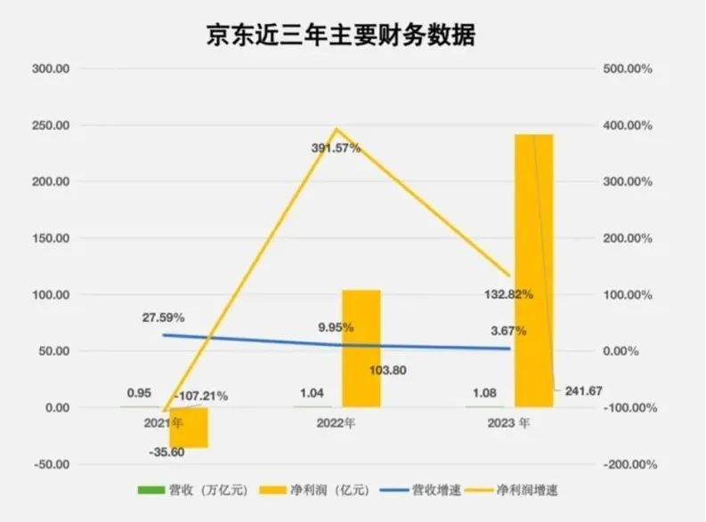 京东为什么采取这样的策略,从最新财报中可窥见一二。财报显示,京东于2023年第四季度的净收入为3061亿元人民币,同比增长3.6%;京东在2023年全年实现了10847亿元人民币的净收入,同比增长3.7%。