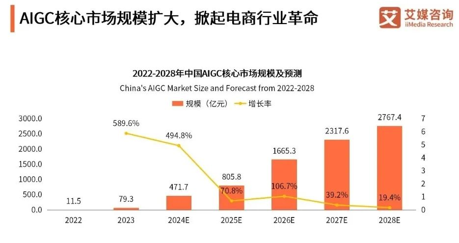 先来看机遇,数据显示,2023年中国AIGC行业核心市场规模为79.3亿元,2028年有望达2767.4亿元。