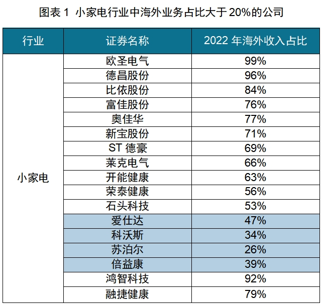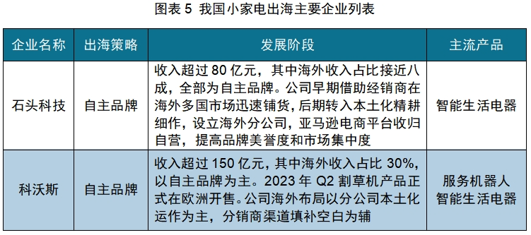 背靠庞大的本土需求市场及丰富的配套产业链,中国小家电制造端在全球具备比较优势;但在跨境品牌运营层面,尽管小家电行业当前已有17家相关知名企业开展海外业务,且其中有13家海外收入占公司总营收超过50%,但除了极个别的公司(如石头科技、科沃斯等),大多数企业仍然以贴牌代工的业务(即制造出海)为主,能实现自主品牌出海的企业并不多,有较大升级的空间。