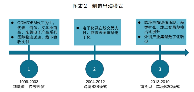 嫁接于互联网电商的外贸模式:主要指跨境B2B和跨境B2C,跨境B2B主要得益于中国加入 WTO 后进一步推动了外贸产业出海进程,在此期间中国产品生产标准更多地与世界标准体系接轨,由此涌现出了更多自主出口外贸公司,发挥其成本优势与供应链管理能力,探索跨境 B2B 模式运作。比较两种贸易模式可知,两者的差异在于后者以电子化和在线交易为主要形式,部分企业通过B2B平台探索将线下交易、支付、物流等流程实现全链条电子化,但实质上制造出海仍以产品代工为主。