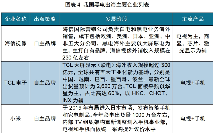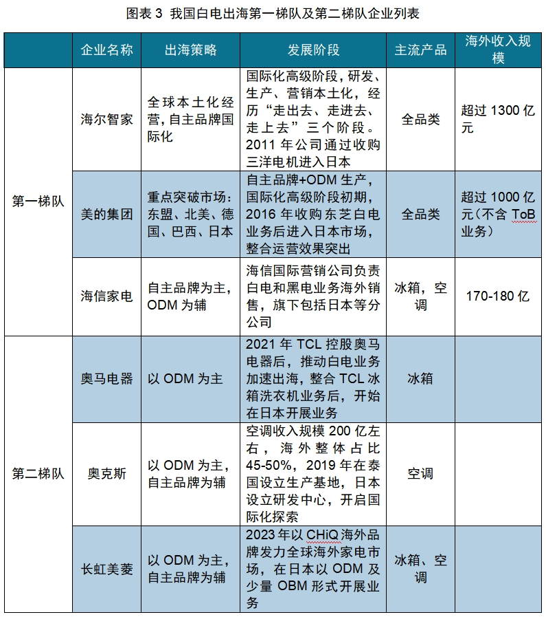白电出海:白电企业出海,海尔、美的、海信等综合家电龙头作为第一梯队, 出海相对较早、自主品牌占比高,国际化程度高,基本进入海外并购本土化运营的高级阶段;奥马电器、长虹美菱、奥克斯则以家电单项品类为突破口,作为出海第二梯队,产品基本以ODM为主,国际化基本处于产品出口初级至海外建立生产基地的中级发展阶段,整体海外收入规模不到100亿。