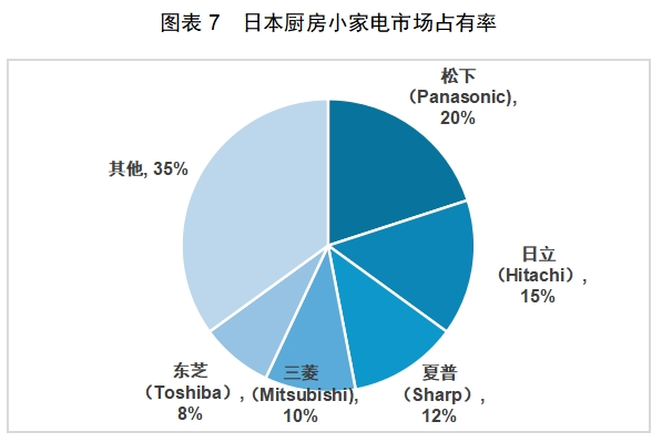 数据来源:日本经济产业省厨房家电市场中,市场占有率排名前五位依次是:松下(Panasonic)、日立(Hitachi)、夏普(Sharp)、三菱(Mitsubishi)和东芝(Toshiba)。