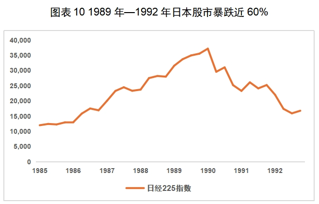 为抑制经济过热,从1989 年开始,日本央行开始连续加息,1989年5月至1990年8月之间,日本商业银行贴现率从1%一路上调到6%,金融政策的急剧紧缩直接导致了日本股票、土地价格暴跌,泡沫经济全面破灭,1989年12月至1992年12月之间,日经指数累计暴跌56%,1991年至2000年日本六大城市商业、住宅价格指数分别下跌 81%、55%,日本经济由此陷入“失去的二十年”。