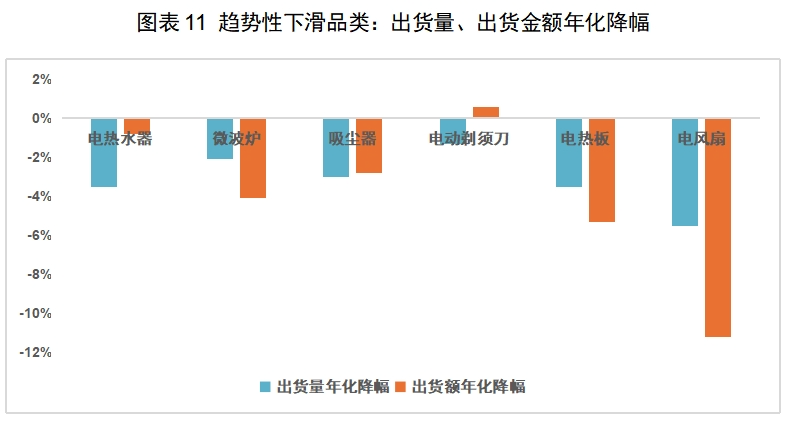 趋势性下滑品类,特点是较早实现普及、缺乏技术创新刺激更新需求。在所统计的13个品类中,电热水器、微波炉、吸尘器、剃须刀、 电热板、电风扇的销量持续下滑,其年化降幅集中在1.5%至3.5%之间。