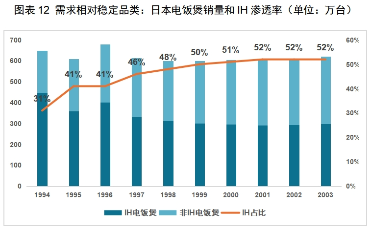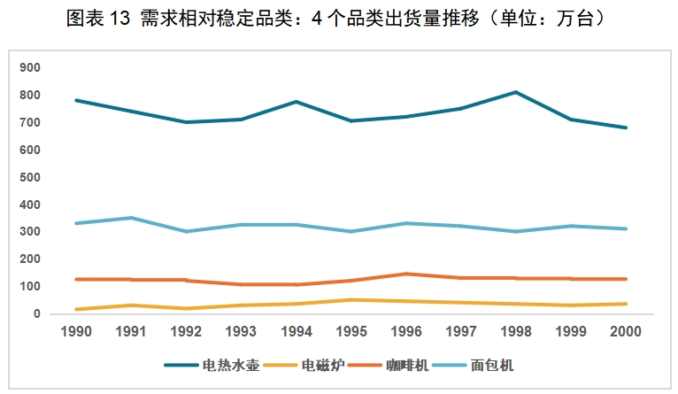 需求相对稳定品类,多以厨房小家电为主,一部分是生活刚需,如电饭煲、电磁炉、电热水壶等,为配合日本消费者对生活品质的不断追求,该类小家电多在此阶段实现了产品升级,如IH电饭煲等产品的出现;一部分则普及率相对偏低,如咖啡机、面包机等,该类小家电在此阶段保持稳定或较慢增长。