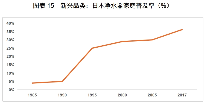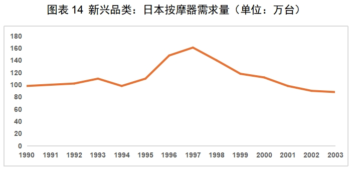 新兴品类,主要是受需求变化和技术创新推动涌现出来的产品,新兴品类多以个护小家电为主,比如 90 年代由于老龄化问题的日趋严重,催生电动按摩器需求短时间内迅速升高,以及日本人民对生活水平标准的不断提高,加之隐孢子虫感染事件的刺激,从而推动净水器需求的释放。