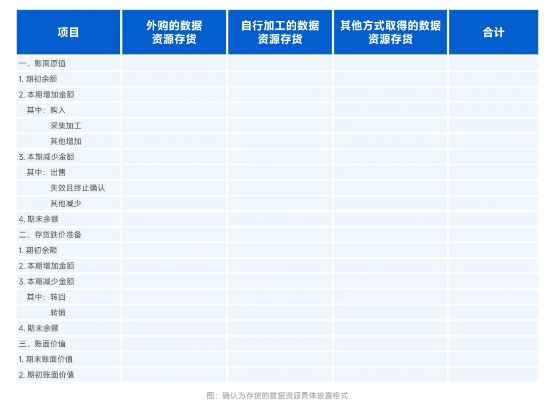 关于数据资源入表的列示和披露要求,企业除了需要在资产负债表“存货”下增设“其中:数据资源”项目;在“无形资产”下增设“其中:数据资源”项目;或在“开发支出”下增设“其中:数据资源”项目进行相关列示外,还应当按照《企业会计准则》及《暂行规定》的相关要求,在会计报表附注中对数据资源相关会计信息进行披露,具体如下: