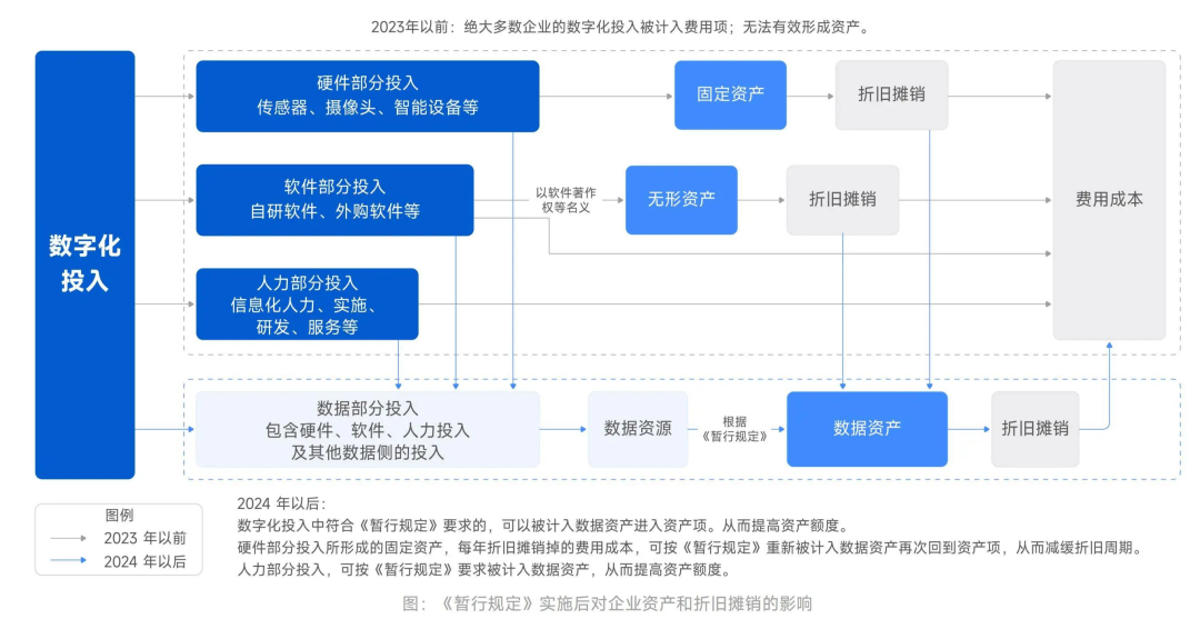 自《暂行规定》正式实施后,企业数字化投入中符合要求的,可以被计入数据资产进入资产项,扩大企业整体的资产规模;企业软硬件投入形成的无形资产和固定资产,每年摊销、折旧掉的费用成本可以被重新计入数据资产再次回到资产项,减缓折旧周期。