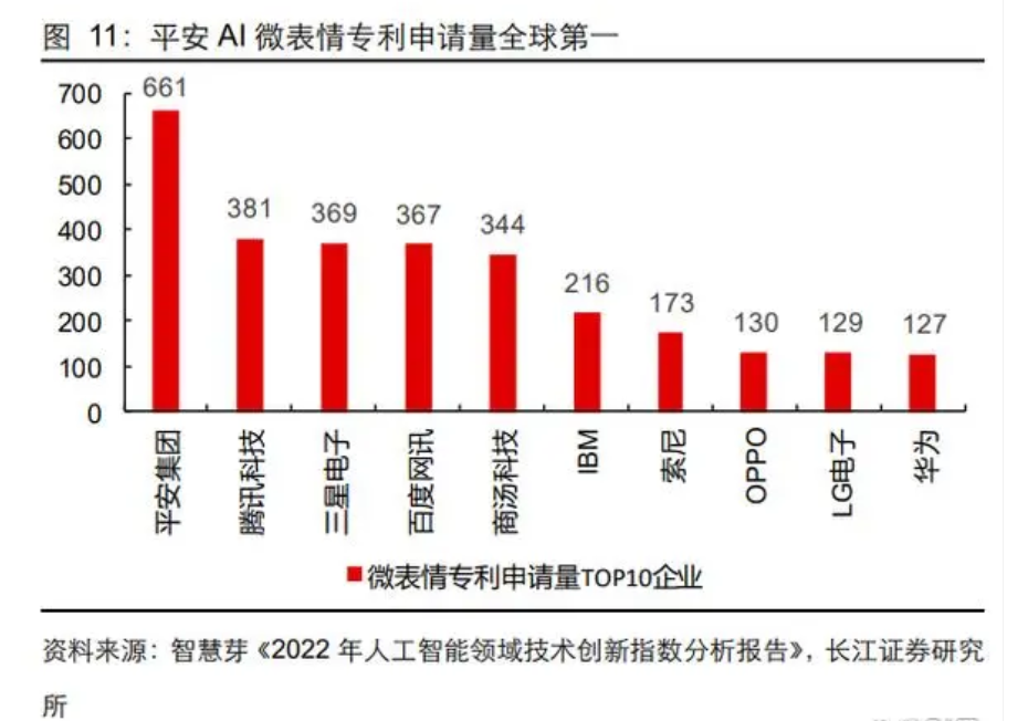 2)在人工智能微表情技术赛道,平安 AI 微表情专利申请量达 661 件,亦是遥遥领先, 根据智慧芽报告,平安集团的微表情识别技术可实现 30 余个 AU 及 10 种情绪的检测, 其中 AU 的最高识别准确度可达 98.1%,平均 86.3%;情绪的最高识别准确度可达 98.2%, 平均 92.1%。并且,该技术已经走出实验室,被应用于识别骗贷行为等风控模型等场景 中。