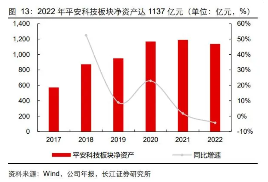 银行方面,口袋银行 app 月活 3357 万,运用先进科技打造“AI 大脑”智慧运营体系。 1)银行方面,截至 2022 年末,平安口袋银行 app 注册数达 1.5 亿人,根据 QuestMobile 数据,2023 年 2 月,平安口袋银行 app 月活数为 3357 万人;2)平安银行运用先进科 技打造“AI 大脑”智慧运营体系,推动 AB 测试机制3的全面应用,2022 年末,已沉淀 超 5000 个客户特征标签,超 100 个大数据模型;“AI+T+Offline”模式上线超 4000 个 应用场景,为超 4900 万客户提供服务。