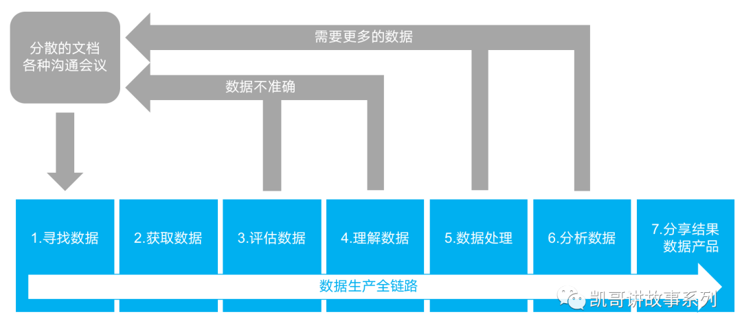 由于没有统一的数据管理工具,所有的数据相关的文档、数据产品和数据都分散在企业不同的系统中,所以当需要数据的时候,工作人员就只能通过分散的文档和各种沟通会议来获得数据,然后评估数据是不是完整,再进行数据的探索和理解。如果数据不准确或者不是所需要的,则又要回到原点去寻找数据。