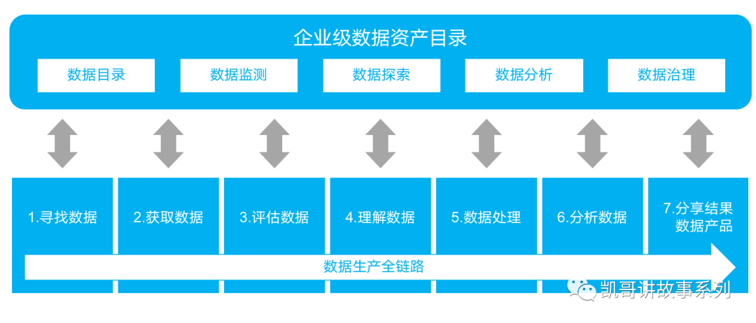 当企业构建起数据资产目录后,数据生产的全链路就形成了,如下所示。