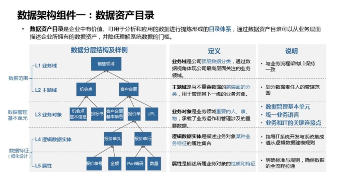 关于数据资产目录的架构建立,可参考业务流程架构,如果企业还没有建立流程架构,可以按企业业务板块,形成数据资产架构的最上层——数据主题域,比如研发或IPD主题域、营销或LTC主题域、人力资源主题域。