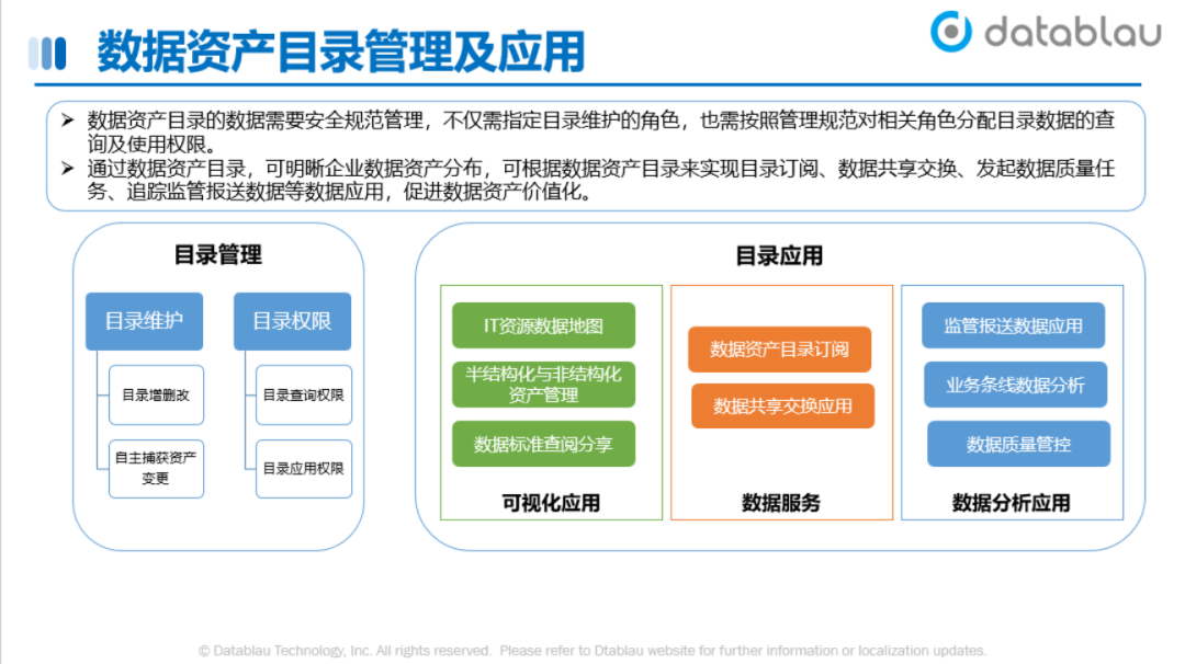 数据资产目录管理包括目录维护及目录安全权限管理,目录应用场景有数据资产的可视化应用、数据资产目录服务、数据分析应用场景等内容。