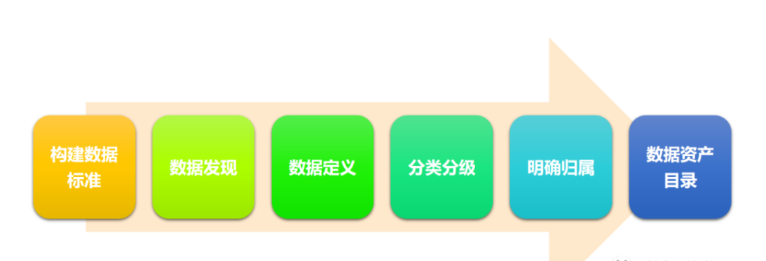 下面介绍数据资产盘点的方法和步骤,主要归纳为6个阶段:构建数据标准、数据发现、数据定义、分类分级、明确归属、数据资产目录。