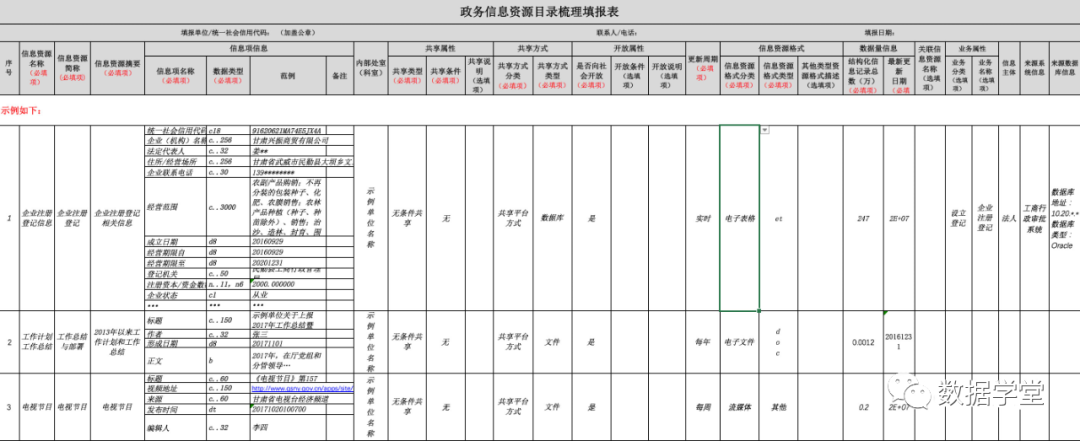 为了摸清企业有多少个业务系统、每个业务系统里面有多少张表、业务系统中的业务表哪些是空的、分别有哪些部门在使用和产生数据等问题,首先需要制定一个数据资产调研表,下图为政务信息资源目录调研表模版表,面向政府部门的: