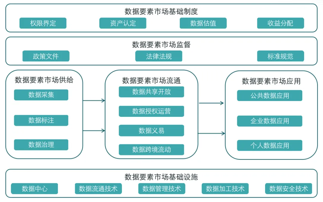 基础制度是保障数据要素市场规范发展的前提条件,市场供给是数据要素市场运行的基础原料,市场流通是数据要素市场运行的主轴枢纽,市场应用是释放数据要素市场经济价值的必经环节,市场监管是维护数据要素市场运行秩序的必要之策,基础设施是推动数据要素市场发展的重要支柱。