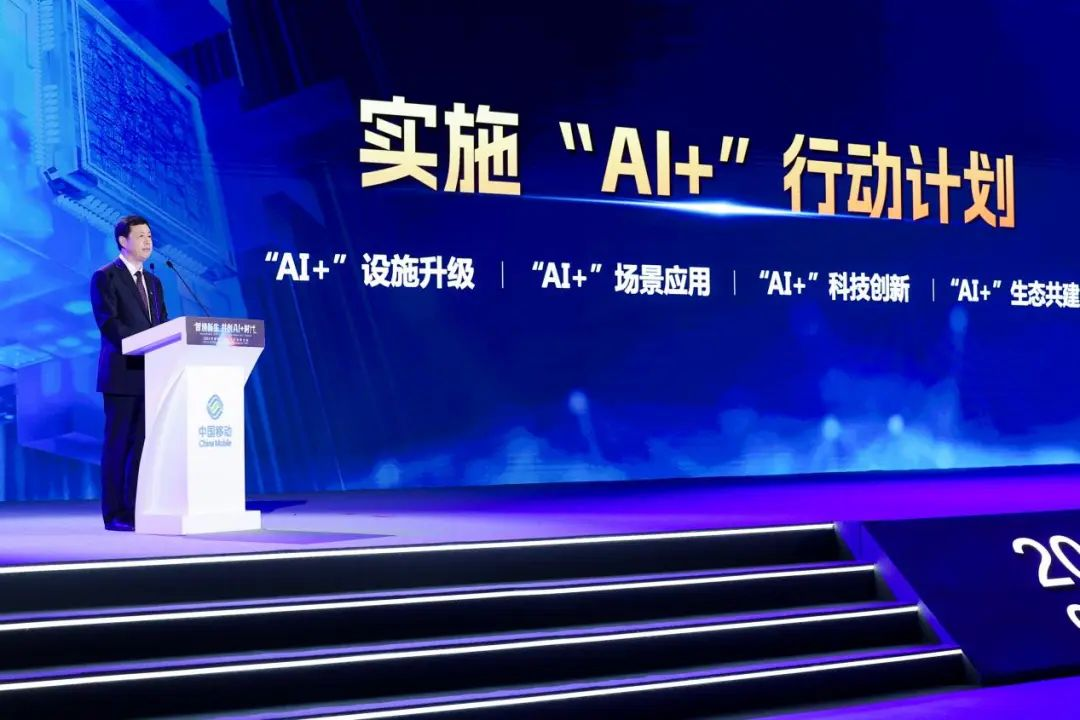 杨杰在大会主论坛上明确表示,经济社会已经从“互联网+”“5G+”迈向“AI+”,进入AI+新时代,中国移动将All in “AI+”,大力实施“AI+”行动计划,聚力推动“AI+”设施升级、“AI+”场景应用、“AI+”科技创新、“AI+”生态共建。
