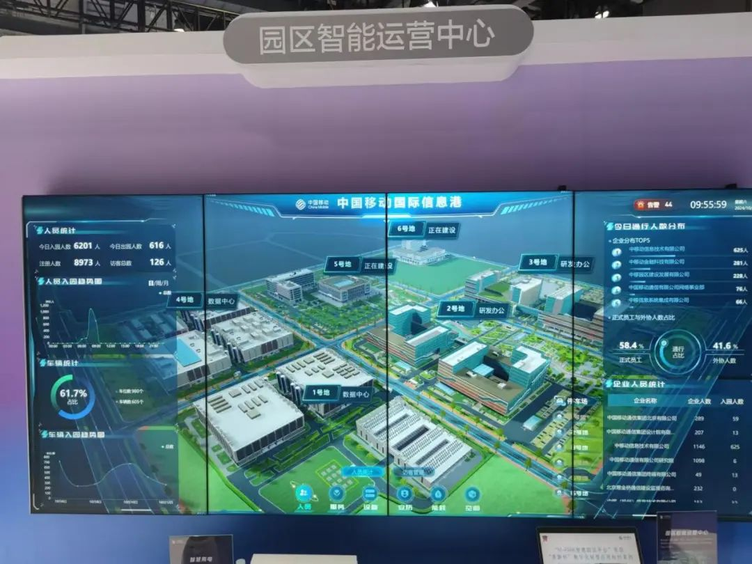 在大会上,中国移动的一处展台,用一块大屏展示了引入“AI+”打造的智慧园区数字化管理平台。通过这块大屏,人们就能了解园区里的人员、服务、设备、空间、能耗、安防的各种细节,一方面实时掌握园区的最新情况,另一方面针对异常情况还有分级别的及时告警,防患于未然,减少阻碍经营的事故发生。