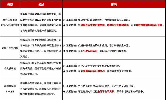 其中有一个值得注意的“专利流氓”——NPE(Non-Practicing Entity),其并不是传统意义上的专利保护机构,而是指那些拥有专利但不实际从事生产制造或销售的主体。这类主体通常通过购买或获得授权拥有创新技术的知识产权,并主要通过专利许可、诉讼或以诉讼相要挟的手段,从目标对象处攫取高额许可费用或者损害赔偿金。