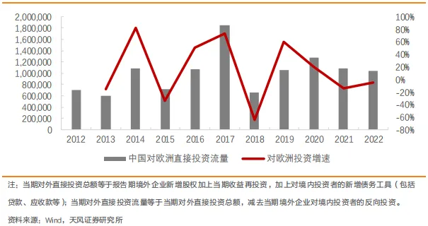 近年来,中国对欧洲的投资维持在一个较低的水平。具体来看,中国对欧洲直接投资流量在 2018年显著下降之后,经历了一段短暂回升期,随后又于2021年和2022年再次下滑。